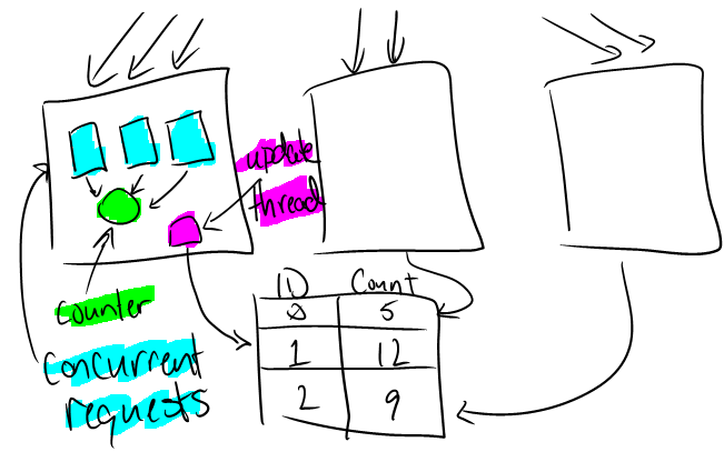 The diagram below shows the basic architecture. Each instance keeps a local count that represents the number of clicks handled by that instance (the green “counter” below). This count is incremented using Interlocked.Increment, so it can be safely updated from any number of threads (blue squares). Each instance also has a single thread responsible for pushing that local count into an entity in table storage (purple square). There’s one entity per instance, so no two instances are trying to write to the same entity. The click count is now the sum of all those entities in table storage. Querying for them and summing them is a lightweight operation, because the number of entities is bound by the number of role instances.