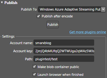 Finally, you can choose the “Windows Azure Adaptive Streaming Publisher” option in the Publish area to invoke the plug-in. You’ll need to provide your Windows Azure storage account name and key, as well as a full path to where you would like the video published (at least a container name, but possibly also a path under that container).