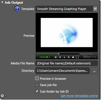 If you want a prepackaged Smooth Streaming player with your content, choose a template in the Job Output area. You might want to uncheck “Preview in browser,” because the publishing plug-in also includes an option to launch the browser once publishing is complete.