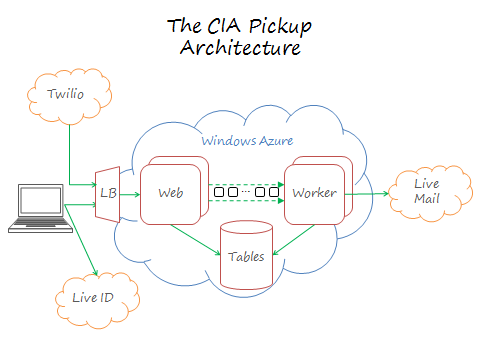 The core web application is running on Windows Azure. The code is written in C# as an ASP.NET MVC web role and a worker role that records incoming calls and sends outgoing email. Twilio is handling the telephony, Windows Live ID is handling authentication, and Windows Live Mail is handling the outgoing mail for the domain theciapickup.com.